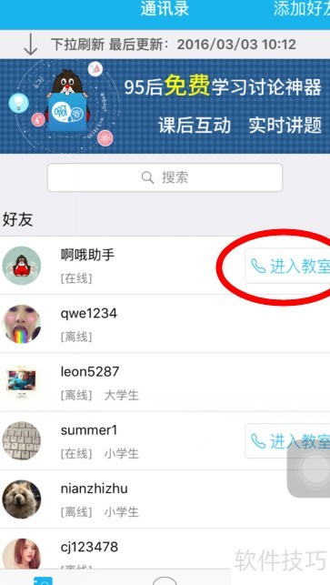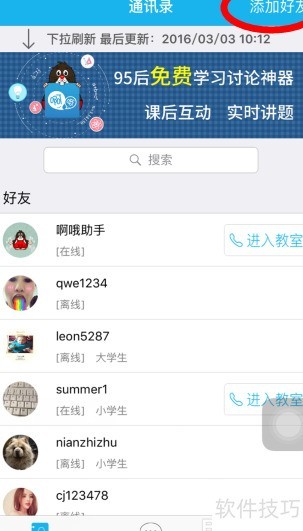 3、 好友账号将显示在通讯录中,随后可邀请师生加入教室。