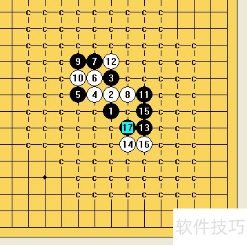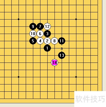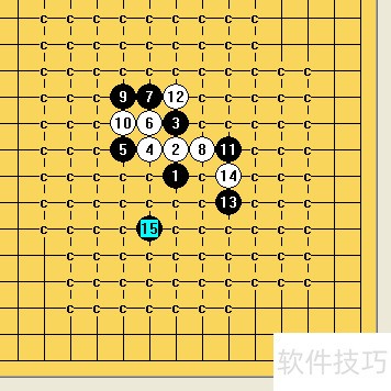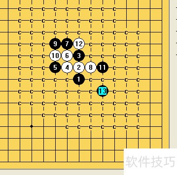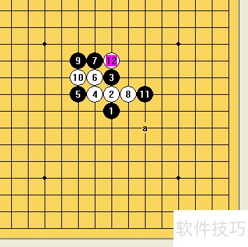 9、 此时黑方优势已被化解,只得转向右上落子于K9,形成斜眠三,借斜线延伸扩大局面。