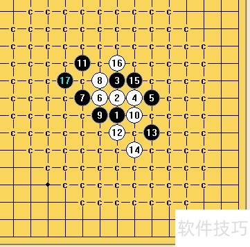 1、 由于14是活三,接下来需判断黑15的防守位置。白方无其他有效连接点,黑方可专注于选择有利进攻的位置。I5过于靠下,且下方缺乏黑子配合,应首先排除;I7虽对右侧略有帮助,但效果有限。因此,黑15应选择I10,以增强上方势力,形成更有利的局面。