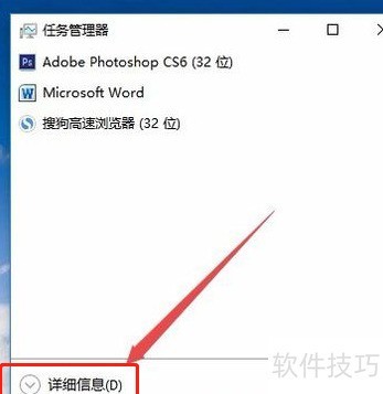 5、 打开任务管理器,点击左下角的详细信息按钮即可查看详细进程信息。