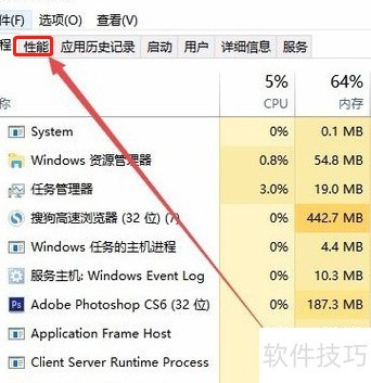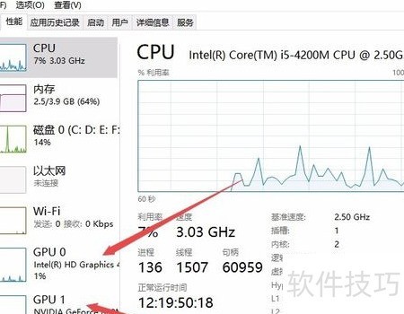 2、 在任务管理器中选择性能标签页,左下角会显示GPU信息。若电脑配备双显卡,则会分别列出GPU0和GPU1两个项目,便于查看各自运行状态。
