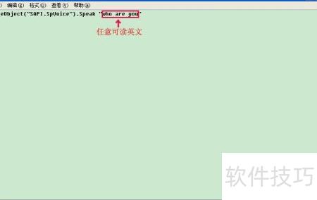 2、 打开记事本,输入CreateObject(SAPI.SpVoice).Speak who are you,其中speak后的内容可替换为其他英文文本,保存后运行即可实现语音朗读功能。