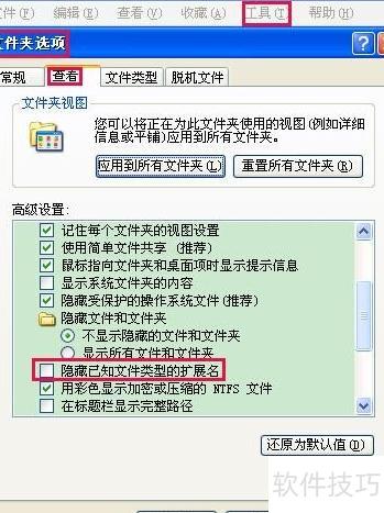 4、 若文件扩展名未显示,可依次进入磁盘窗口的工具、文件夹选项、查看,取消勾选隐藏已知文件类型的扩展名即可。