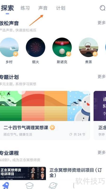2、 进入探索页后,点击顶部的声音选项。