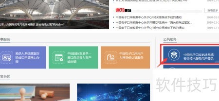 2、 访问中国电子口岸官网,进入页面右侧的公共服务栏目,选择首个选项中国电子口岸执法系统安全技术服务用户登录,点击后将跳转至电子口岸登录界面,具体样式所示。