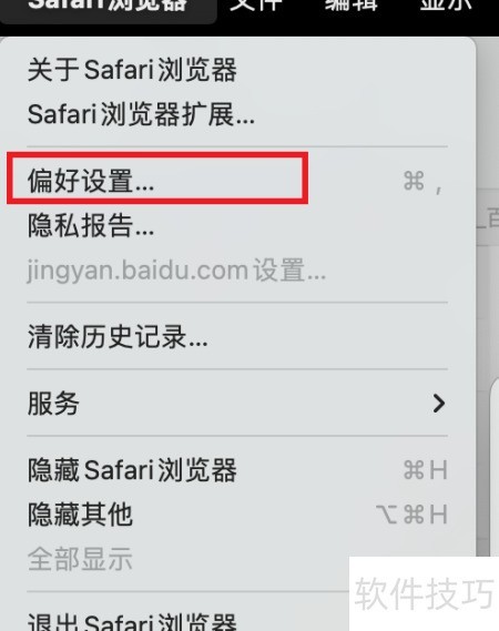 1、 启动Safari浏览器,点击顶部菜单中的Safari,进入偏好设置进行配置。