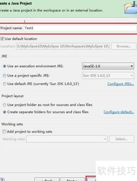 3、 在创建Java项目界面中,为项目名称输入一个以英文字母开头且首字母大写的名称,其余部分可使用字母和数字组合。填写完毕后点击Finish按钮,其他选项无需更改。点击完成后会弹出提示对话框,此时选择No即可继续操作。