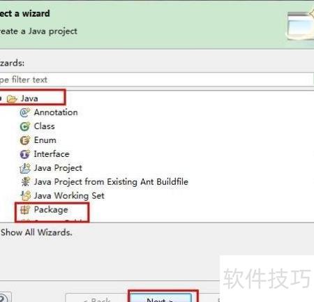 5、 在Select a Wizard窗口中,定位到名为java的文件夹,展开其内容后选择package选项,点击next。进入Java Package界面后,在Name输入框中设置名称,需以小写英文字母开头,后续可包含字母与数字,其余选项保持默认。确认无误后,点击Finish完成操作。整个过程需注意命名规范,确保符合系统要求,避免使用特殊字符或中文命名,以保证创建成功。