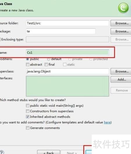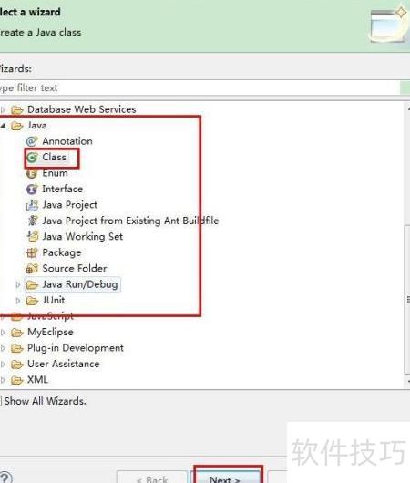 7、 在Select a Wizard窗口中,定位到名为java的文件夹,展开其内容后选择class,然后点击next。进入Java class界面后,在Name输入框中设定名称,要求首字符为大写英文字母,后续可使用字母或数字组合,其余选项保持默认。确认无误后,点击Finish完成操作。