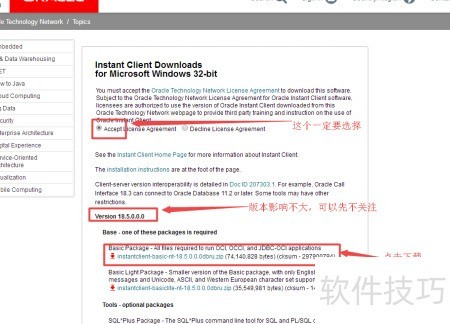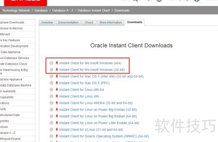 9、 访问网址:http://www.oracle.com/technetwork/database/database-technologies/instant-client/downloads/index.html,进入Oracle官方网站的Instant Client下载页面,查找并选择适用于当前操作系统的数据库客户端版本,根据提示完成文件的下载与安装,确保开发环境或应用程序能够顺利连接Oracle数据库。