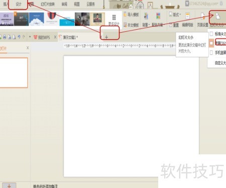 1、 点击加号快速创建新幻灯片,再通过设计选项调整幻灯片尺寸。
