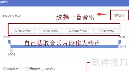 4、 点击制作铃声,挑选一首喜欢的音乐,截取其中一段作为铃声。完成后可先保存下载,再通过官方iTunes同步,或直接连接iPhone等设备,使用PP助手导入即可轻松设置个性化铃声,操作简单便捷,让手机来电更富个性与乐趣。