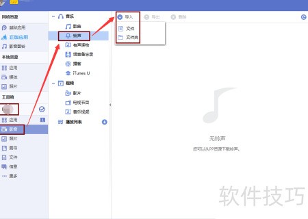 6、 无论是自制铃声还是转换格式的音频,最终导入方法相同。可通过官方iTunes同步,也可使用PP助手直接导入。连接iPhone后,进入影音板块,选择铃声功能,在导入选项中选取所需的m4r格式铃声文件即可完成操作。