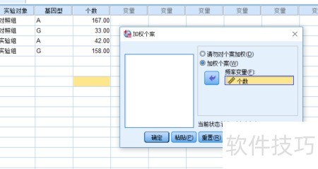 4、 第二步是进行个案加权:依次选择数据菜单中的加权个案功能,勾选启用加权项,并将个数变量指定为频率变量,最后点击确定完成设置。由于当前数据中每一行代表多个观测对象,因此必须加权处理。若数据为原始个体记录,每行仅对应一个样本,则无需此步骤。