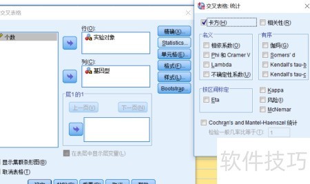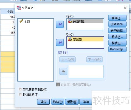 6、 将实验分组变量置于行框,基因型变量置于列框。χ2检验用于分析实际频数与理论频数的一致性,行、列变量位置可互换,不影响检验结果。