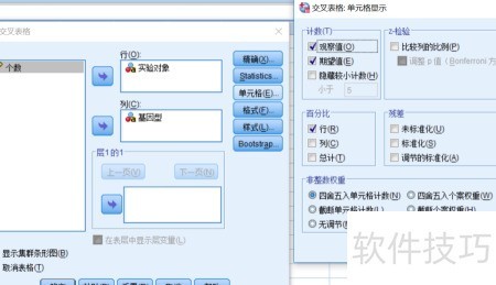8、 在单元格设置中,勾选计数项下的观察值与期望值,以显示实际与理论频数;在百分比中选择行,展示各组基因型占比,完成后点击继续,最后确认。