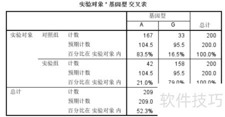 9、 在结果解释中,实验对象与基因型的交叉表不仅列出实验组和对照组各基因型的实际计数及百分比,还包含预期计数(即行总计与列总计乘积除以总样本数)。需特别注意,这些理论频数与总例数将直接影响后续卡方检验方法的选择与判断。