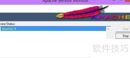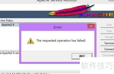1、 安装Apache(具体步骤见备注)。进入bin目录,运行apacheMonitor.exe,点击start启动Apache服务。所示,当前无法启动Apache 2.4版本服务,提示启动失败,需检查配置或端口占用情况以解决问题。