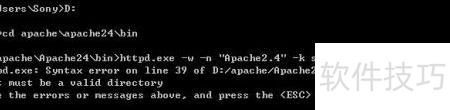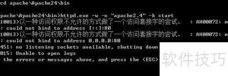 6、 重新启动程序,输入cmd,进入Apache安装目录下的bin文件夹,执行命令:httpd.exe -w -n Apache2.4 -k start,操作效果所示。