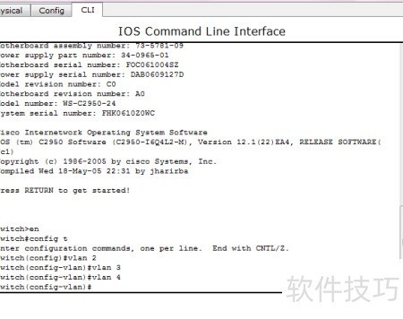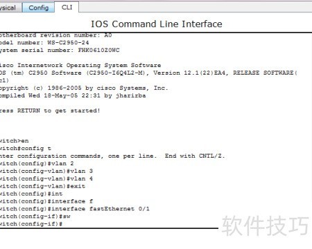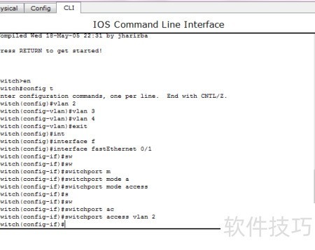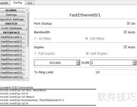 6、 通过命令行可将VLAN 2分配给fa0/1接口,并使用no shutdown命令启用该接口。此外,也可不采用此方法,直接在配置模式下手动完成相应设置,实现相同功能。