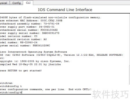 3、 进入交换机命令行后,先处于普通模式,输入enable进入特权模式,再执行config terminal进入终端配置模式。