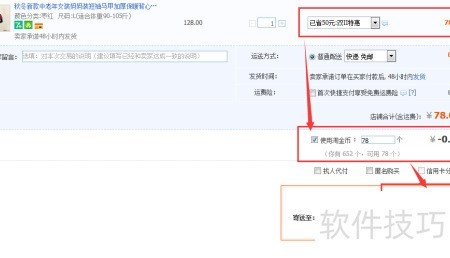 8、 在淘宝选好商品并提交订单后,进入订单确认页面,在付款金额位置可看到使用淘金币选项。每个店铺都会规定可使用的淘金币数量,用户使用时不得超过该上限。