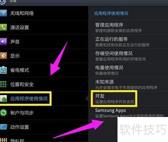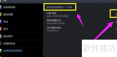 2、 开启平板,进入设置中的应用程序菜单,选择开发选项,然后在开发列表里启用USB调试功能。