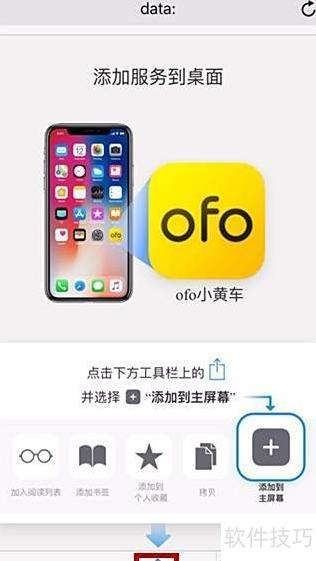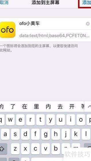 8、 第八步:点击添加到主屏幕,弹出ofo小黄车相关信息,确认添加即可完成操作,所示。