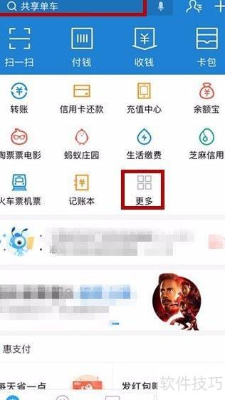 2、 进入支付宝首页后,点击更多选项,浏览并找到需要添加到桌面的小程序。若已知名称,也可直接在首页顶部搜索栏中输入查找。点击更多按钮,操作所示。