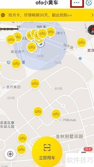 4、 点击ofo小黄车图标后,页面将自动跳转至操作中心,寻找并点击三个点组成的图标,具体位置所示。