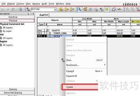 10、 右键点击default,选择创建物理cset,以设定特殊线宽。