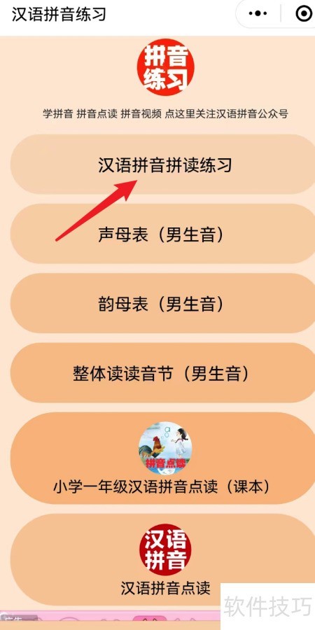 1、 打开微信,进入拼音学习功能,点击拼读练习,即可开始汉语拼音的训练页面。