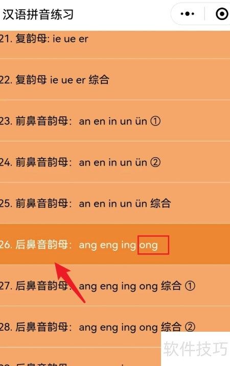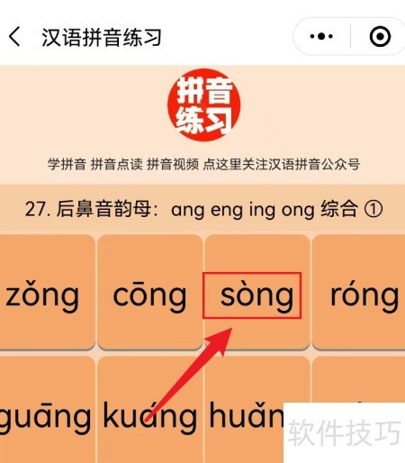 3、 在练习后鼻音韵母ong时,找到song并点击小方块,即可查看其汉语拼音的拼读方式。