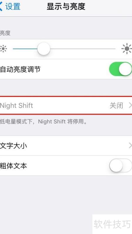 2、 进入设置中的显示与亮度,在低电量模式下通常无法启用夜览功能。但通过调整相关设置,可在电量较低时依然开启夜览,减少蓝光对眼睛的刺激,提升夜间使用舒适度。