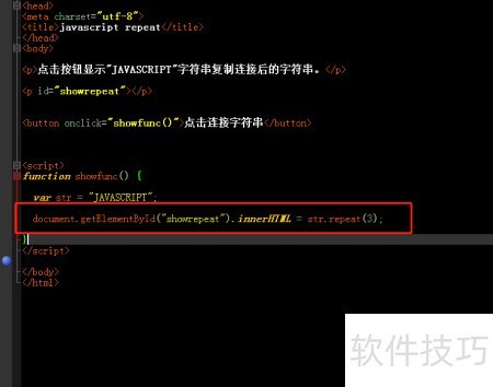 5、 将字符串用repeat方法复制三次,再拼接另一字符串,最后显示在p元素内。