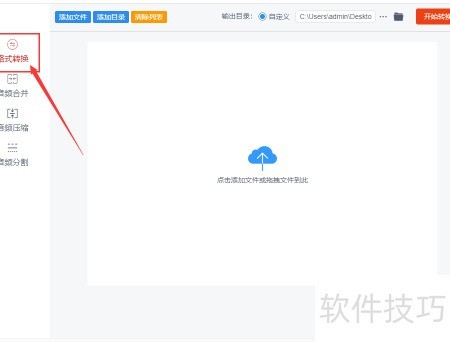 1、 启动电脑后,运行优速音频处理器,界面左侧为功能区,点击顶部的格式转换选项,即可进入下一操作步骤。