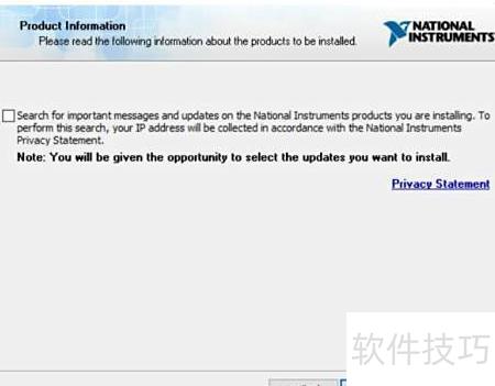 6、 在安装国家仪器公司的产品时,取消选择搜索已安装产品的关键信息和更新这一选项。若勾选该功能,系统将为查找相关重要通知及软件更新而自动收集您的IP地址,此行为遵循国家仪器公司的隐私政策规定。为保护个人网络信息,建议您主动取消该项授权。完成设置后,点击下一步继续安装流程。此举可有效避免本地计算机的IP地址被远程采集,增强安装过程中的数据安全性与隐私保护水平。整个操作简单直观,无需额外技术知识,用户只需在安装向导的提示界面中仔细查看选项内容,做出相应调整即可。后续步骤将依照正常安装顺序进行,不影响软件功能完整性。