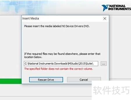 11、 安装时若弹出提示请插入标有NI设备驱动程序DVD的介质,点击取消即可,无需插入光盘或进行其他操作,继续完成后续安装步骤。