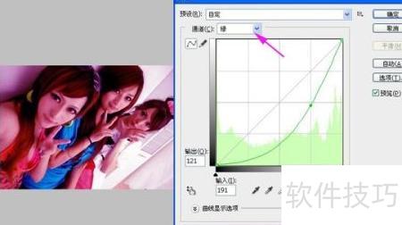 3、 在第二个图层中,开始准备闪图所需的素材。可以通过调整图片色彩来呈现闪图效果,也可直接添加新图片覆盖该图层作为素材。接着点击图像菜单,选择调整中的曲线功能。在弹出的设置窗口中,可从通道选项里选取绿色进行调节,当然也可根据个人喜好选择其他颜色通道。为实时查看调整效果,建议勾选界面右侧的预览框,持续微调曲线直至达到理想视觉效果为止。整个过程灵活自由,便于实现个性化设计。