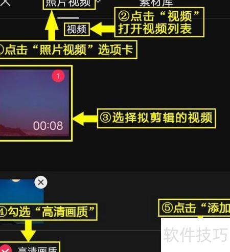 4、 进入照片视频页面,选择视频并打开列表,挑选需要剪辑的视频,勾选高清画质,确认后点击添加即可完成导入。