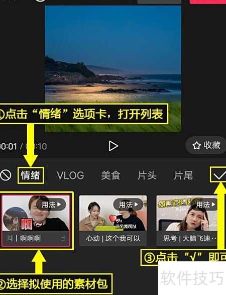 6、 进入情绪选项卡,浏览并选择所需素材包,确认后点击右上角的√完成应用。
