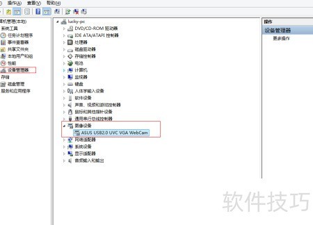 3、 进入界面后,按红色框标注的路径依次点击设备管理器→图像设备,找到已安装的摄像头驱动,右键选中该驱动,选择更新驱动程序软件即可完成操作。