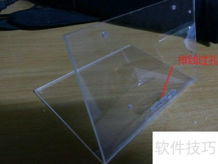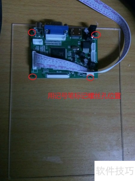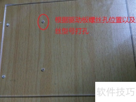 3、 根据驱动板尺寸裁剪亚克力板,用记号笔对照板上螺丝孔位置在亚克力板标注,再用电钻钻孔,即可制成显示器支架。