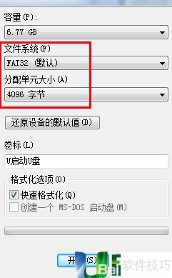 2、 此时会弹出U盘格式化窗口,显示文件系统为FAT32,分配单元大小为4096字节。
