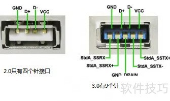 4、 3.0接口有9个针脚,2.0接口则为4个。