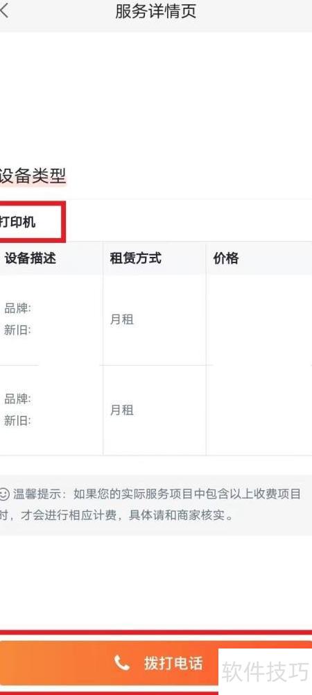 4、 选择办公家具时选定打印机,查看设备详情与月租费用,电话咨询后完成租赁。
