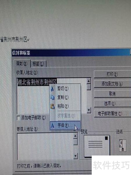 3、 在信封和标签对话框中,右键点击地址并选择字体,于弹出的设置窗口中调整字号,使地址内容完整显示为一行。