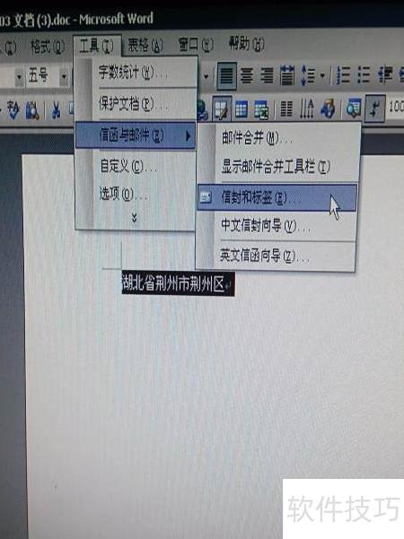 2、 在标题菜单栏中依次选择工具(T)、信函与邮件(E),然后点击信封和标签(E),即可打开相应对话框。