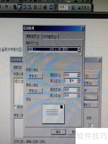 4、 单击选项(O)打开对话框,在信封选项(E)中选择信封尺寸,并在打印选项(F)子菜单内设定送纸方式。