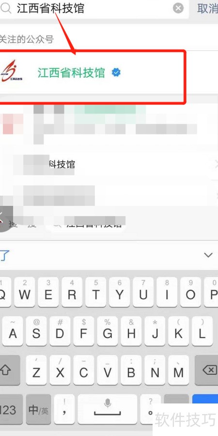 2、 在微信右上角点击搜索,输入江西省科技馆并进入其官方页面。